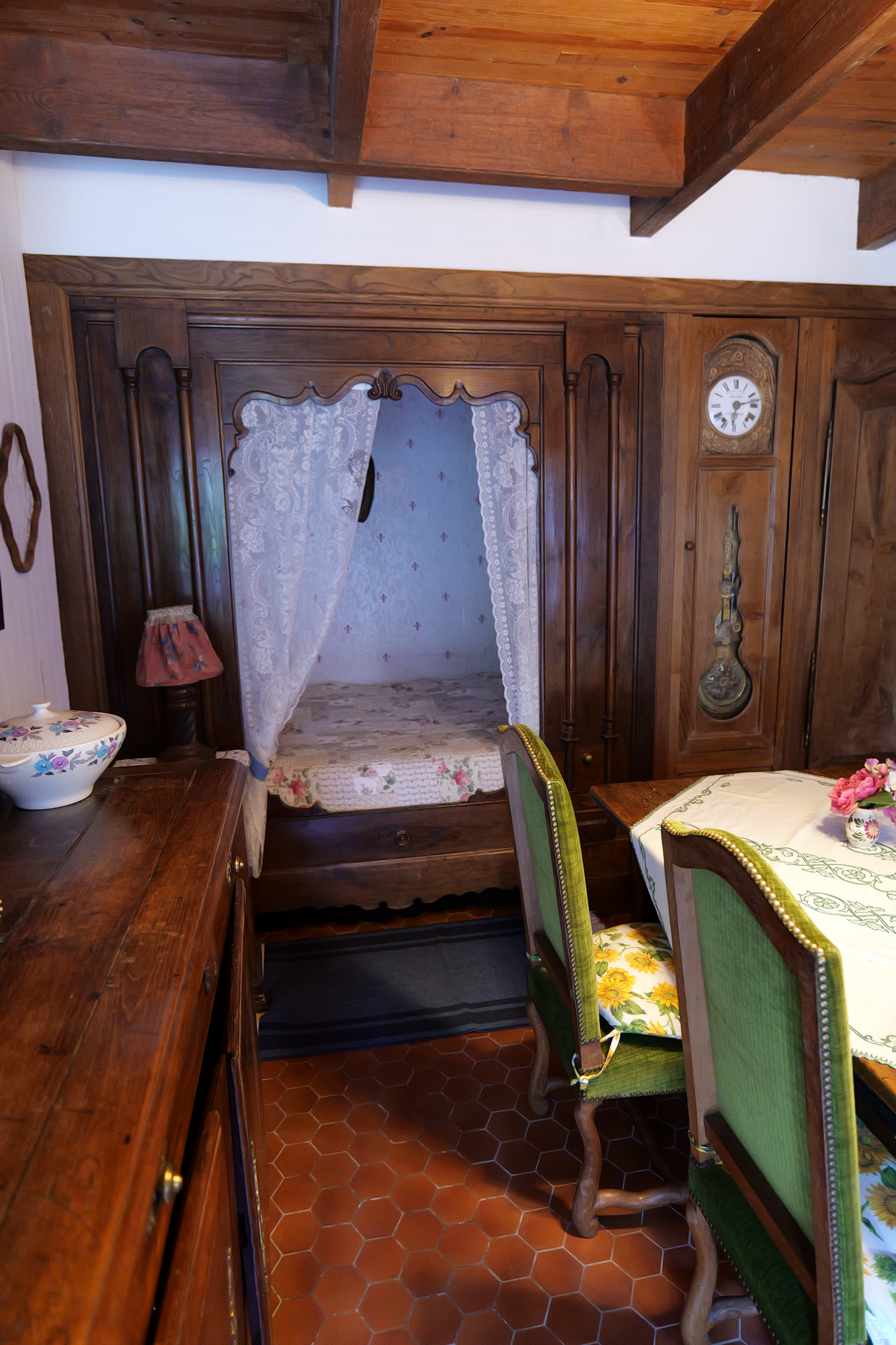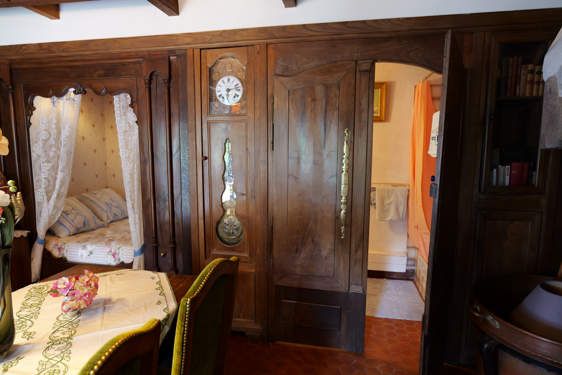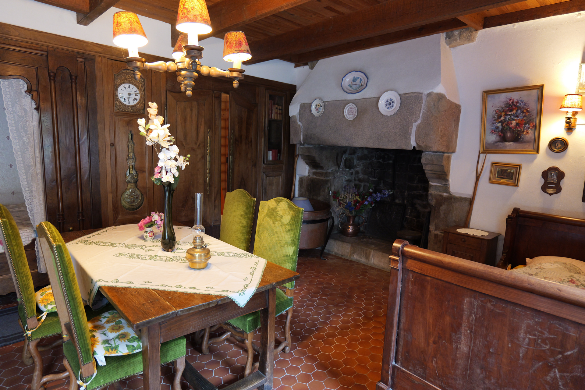 Cette grande chambre au RDC possède un lit double a baldaquin, dans le plus pur esprit traditionnel, une cheminée, table pour 4 personnes et SDB avec douche.