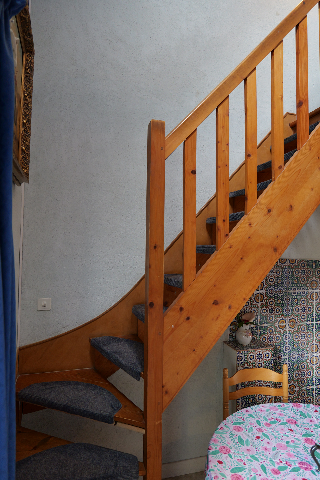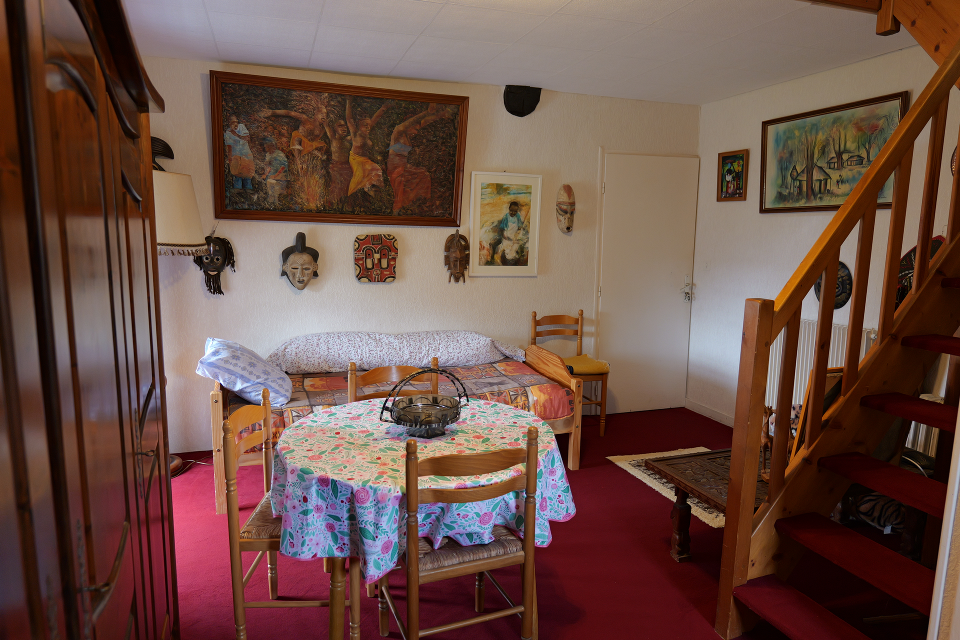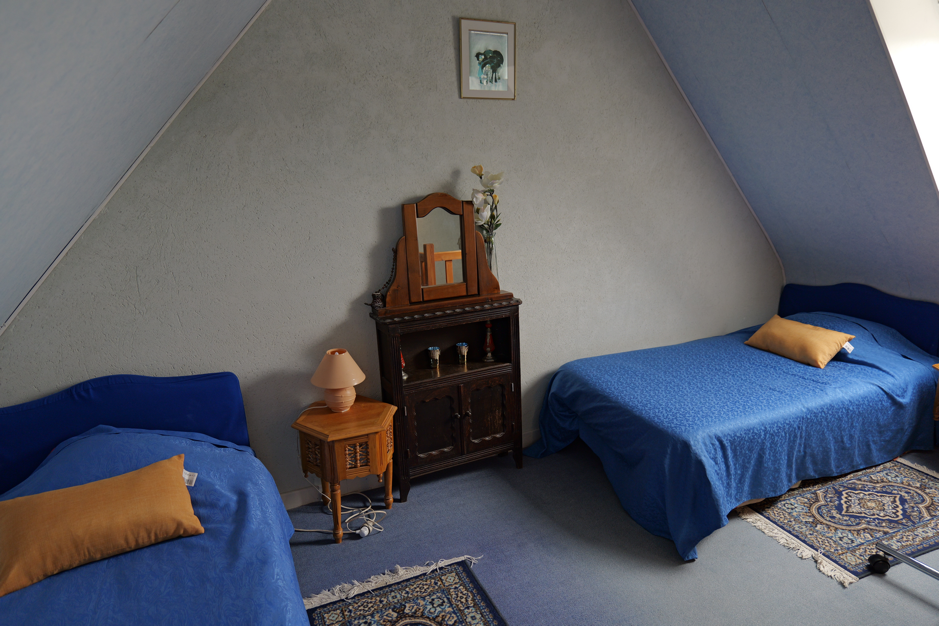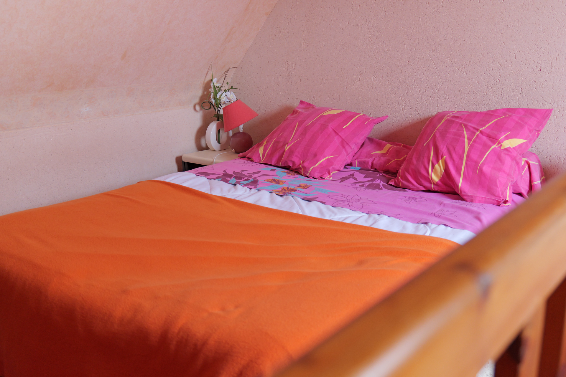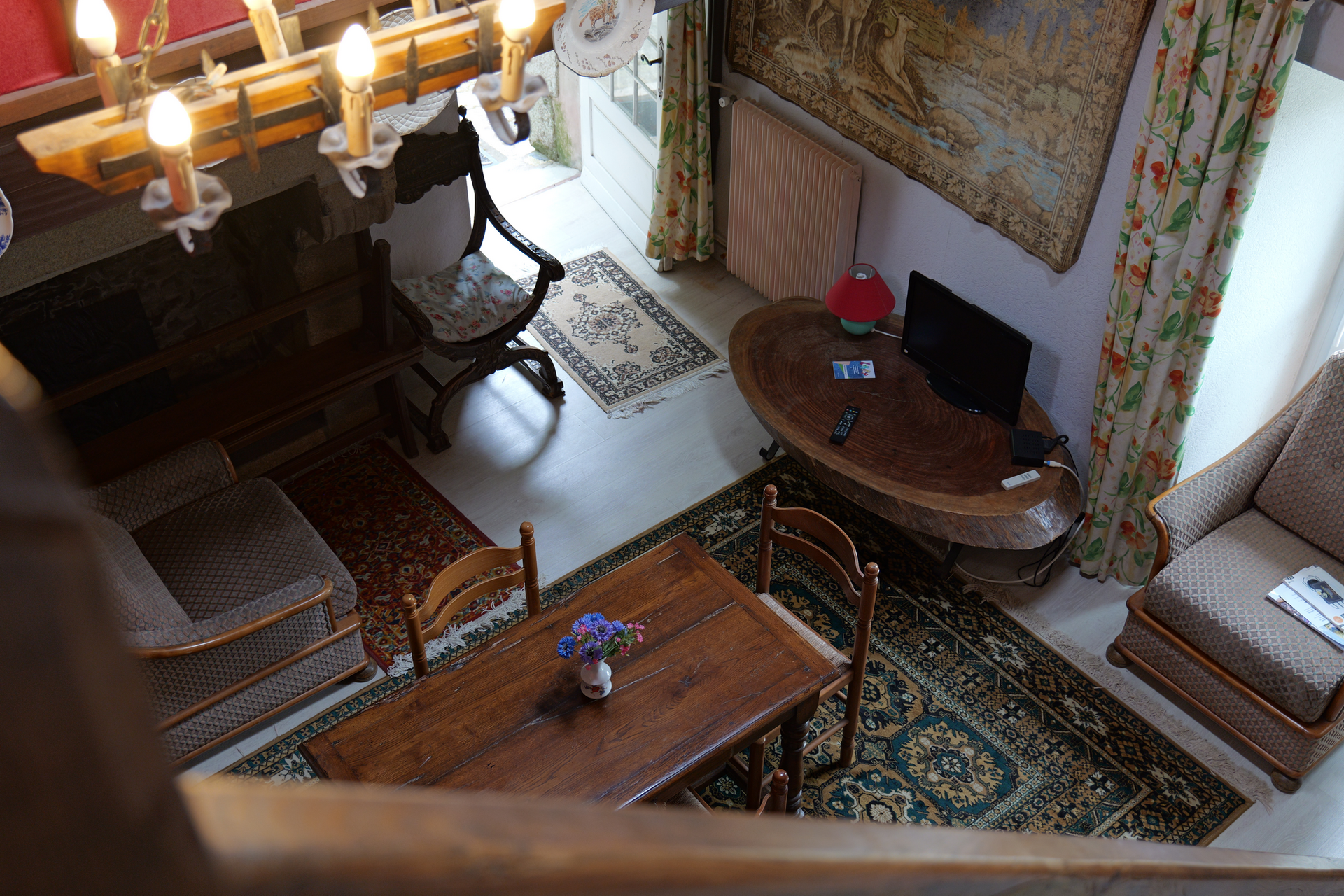 Cette grande chambre en duplex possède un lit double, et un lit simple à l'étage. Un autre lit simple au RDC est disponible. Séjour et cuisine attenante, cette chambre peut accueillir jusqu'à 4 personnes.